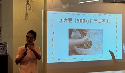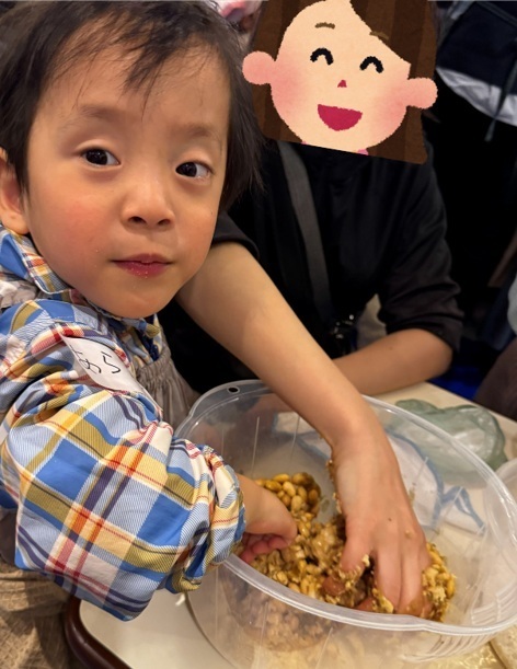 大豆をつぶす工程が特に時間を要し、ご家族みなさんで力を合わせて取り組んでいただきました。他にも混ぜる、丸める、容器に入れるなど複数の作業がありましたが、ひとりひとりができることに挑戦し、達成感を味わうことができたと思います。