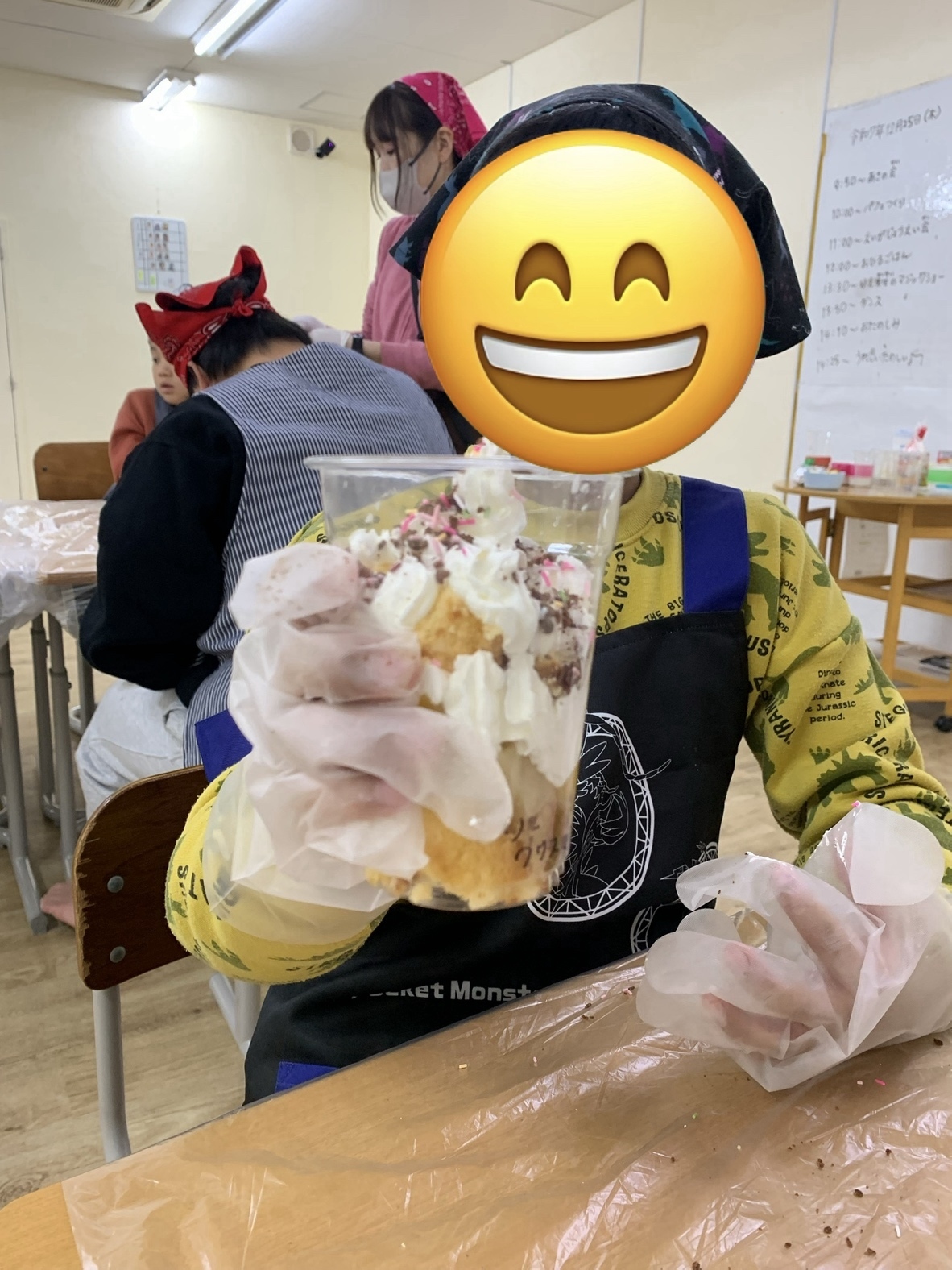 クリスマス会をしました。フルーツ・クリームを自分でトッピングするケーキを作りました。その後おやつとして食べました。サンタクロースからのサプライズも楽しいクリスマスになりました~。